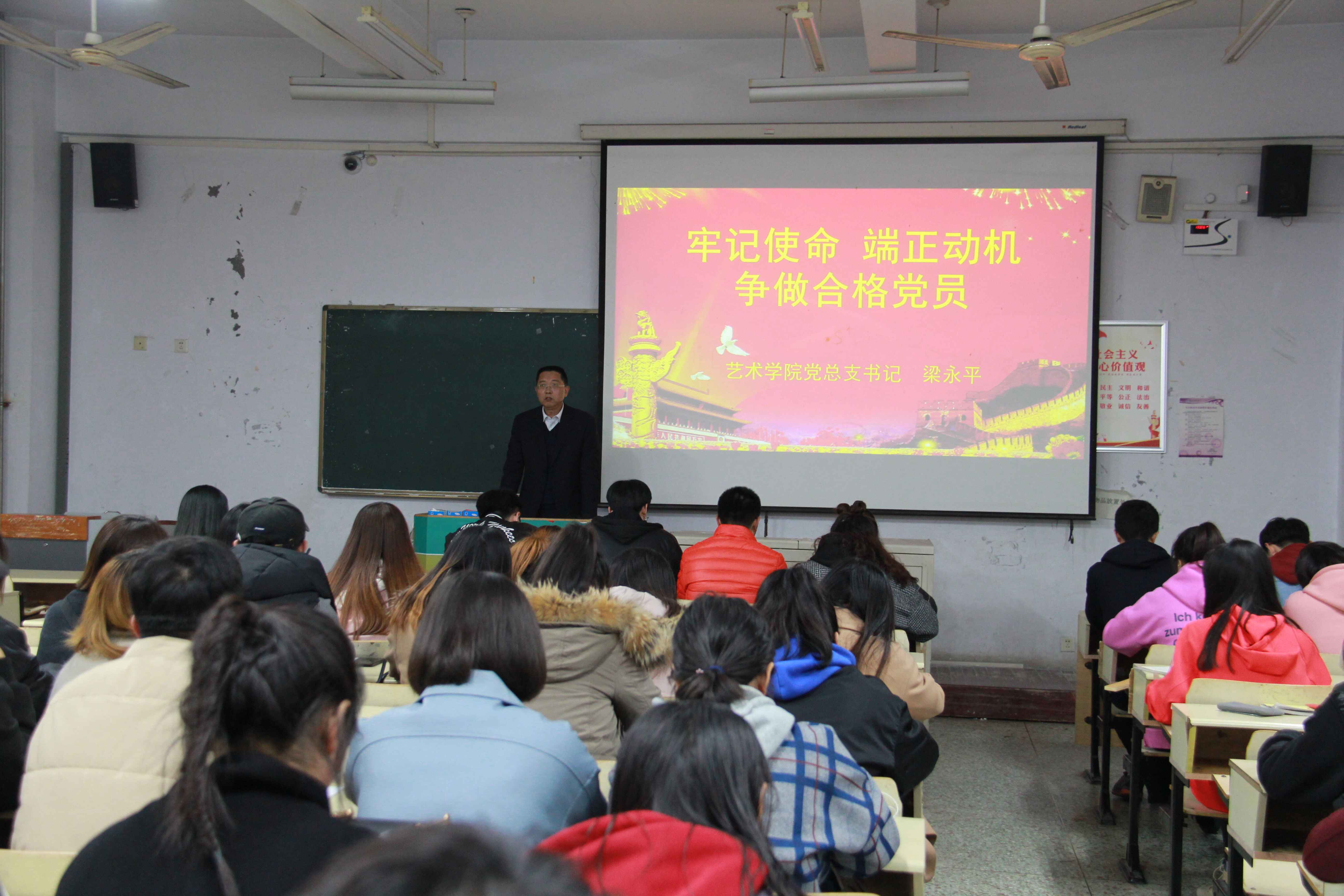 11月14日,艺术学院党总支书记梁永平在教学区为学院入党积极分子、发展对象和学生党员讲主题为“牢记使命 端正动机 争做合格党员”的专题党课。学院全体入党积极分子、发展对象和学生党员参加。