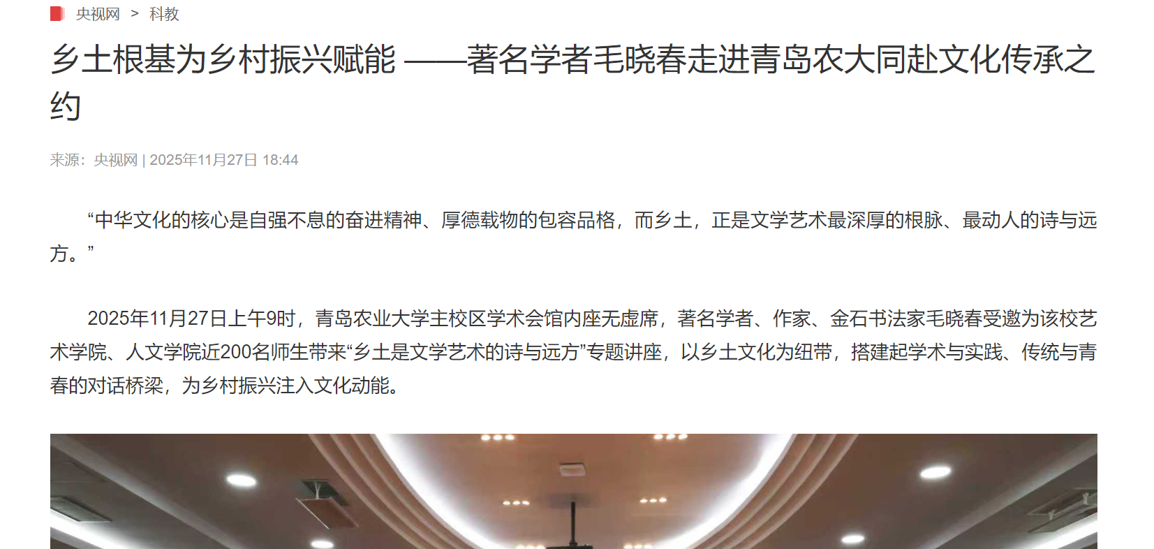 【编者按】11月28日,央视网、农民日报、中国农网、华人日报网、中国新闻在线、中国资讯网以《乡土根基为乡村振兴赋能 ——著名学者毛晓春走进青岛农大同赴文化传承之约》为题,报道青岛农业大学邀请著名学者毛晓春作“乡土是文学艺术的诗与远方”专题讲座。