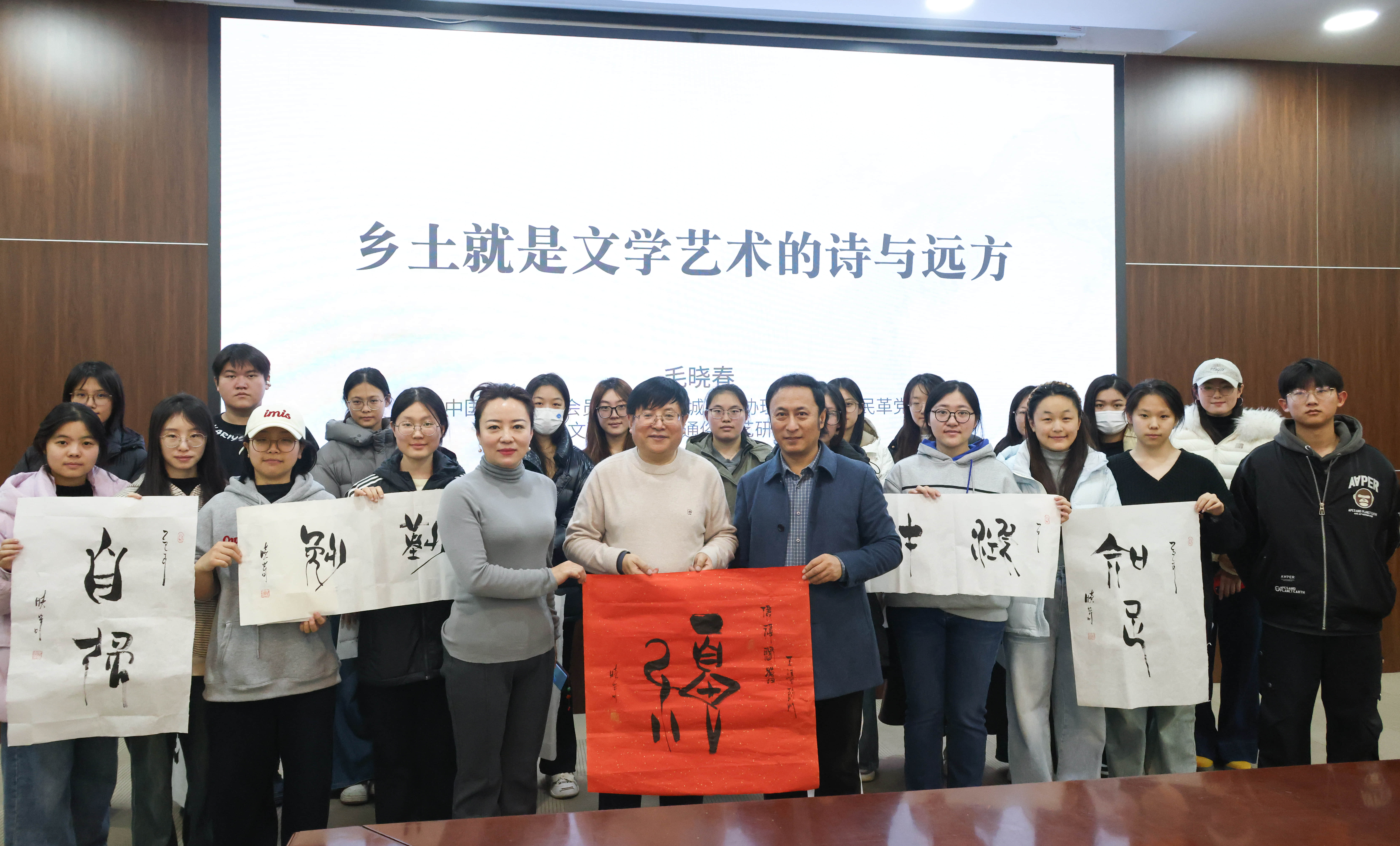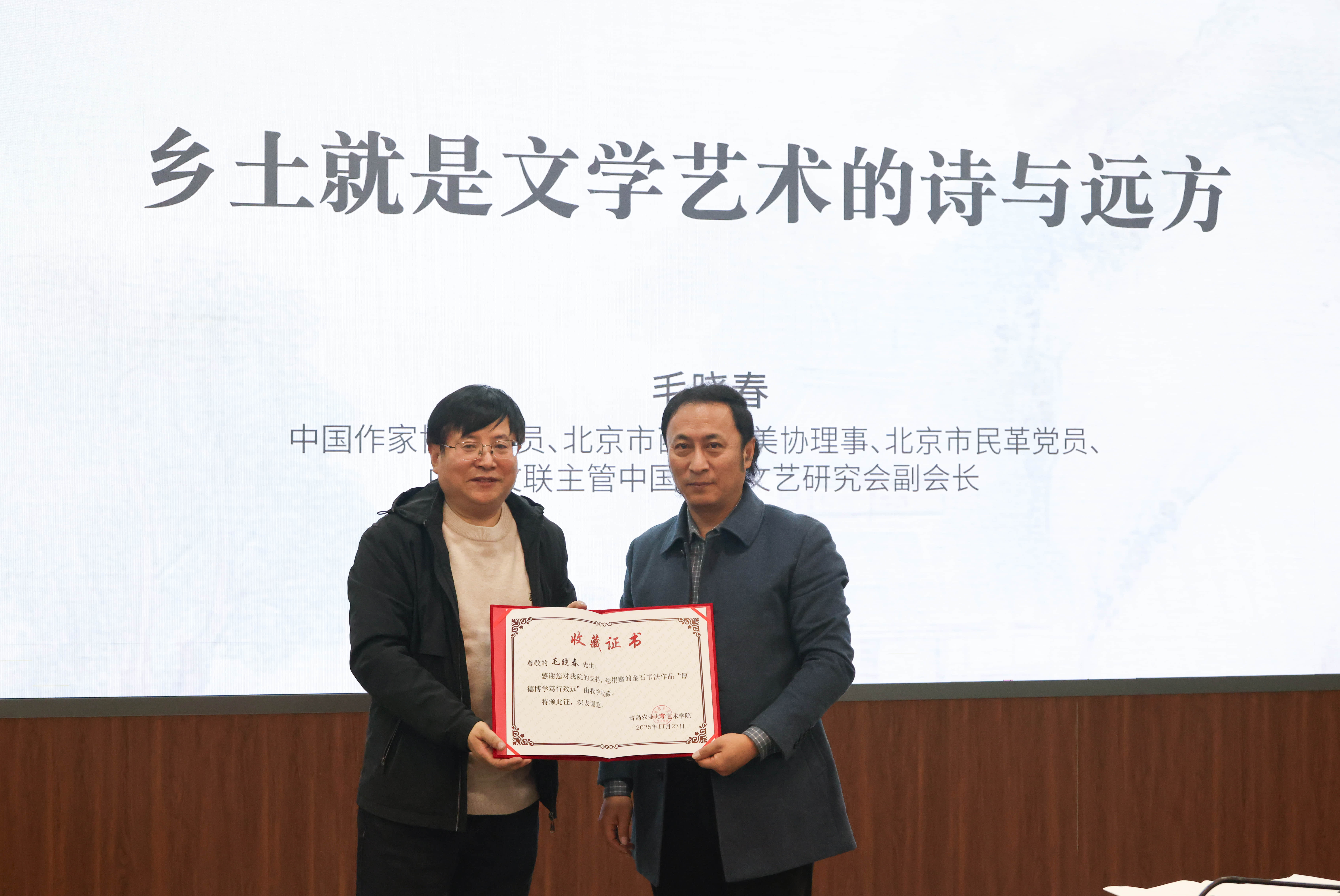 2025年11月27日上午9时,青岛农业大学主校区学术会馆内座无虚席,著名学者、作家、金石书法家毛晓春受邀为该校艺术学院、人文学院近200名师生带来“乡土是文学艺术的诗与远方”专题讲座,以乡土文化为纽带,搭建起学术与实践、传统与青春的对话桥梁,为乡村振兴注入文化动能。