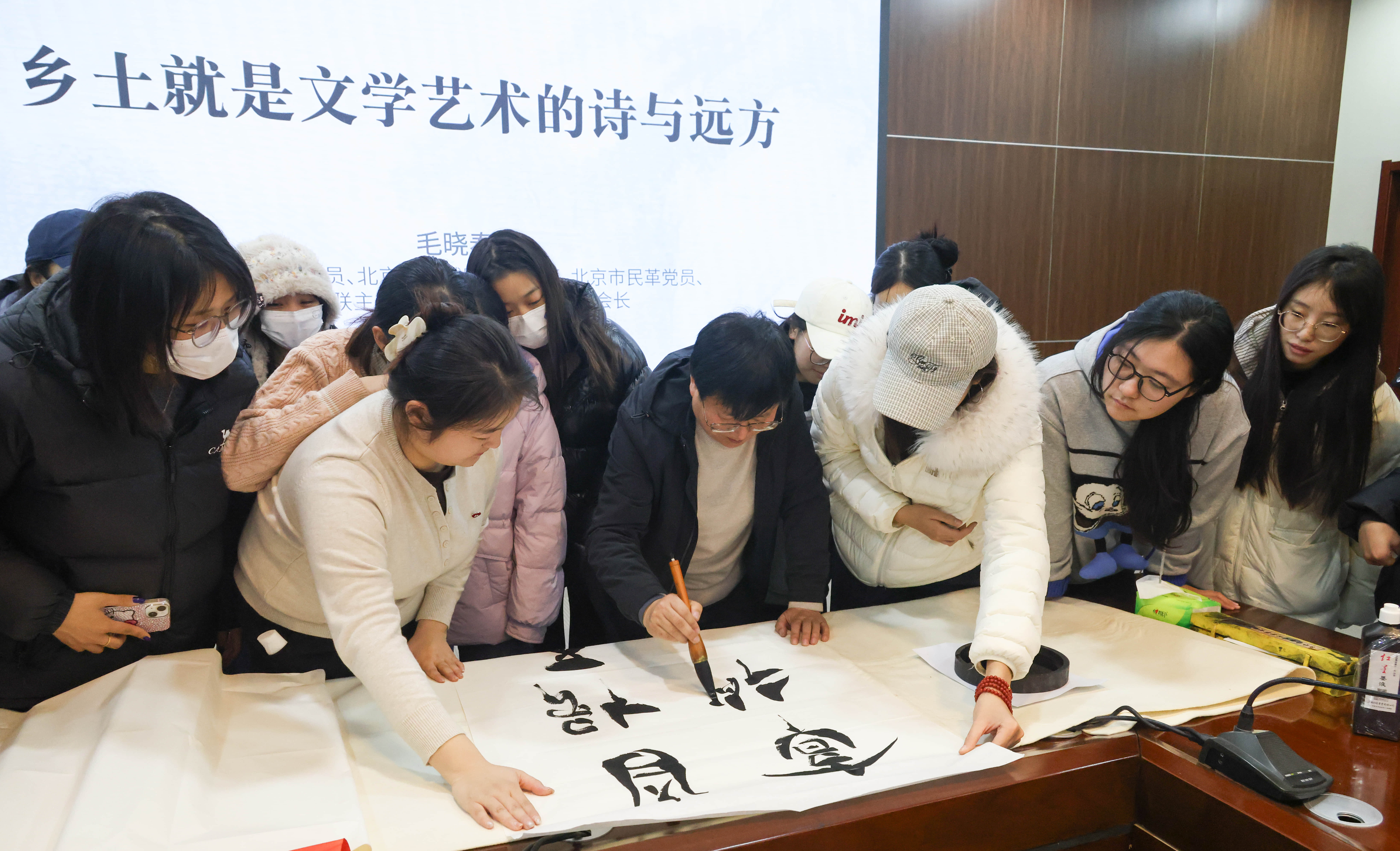 讲座后的书法交流环节更添文化温度。同学们踊跃上前,希望能得到毛晓春的墨宝作为成长激励。尽管书写过程中汗水浸湿衣衫,毛晓春仍耐心为每位同学题字,写下“扎根乡土”、“艺无止境”等作品,他笑着说:“梁启超先生说‘少年强则国强’,看到你们对传统文化的渴求、对乡村未来的期待,再辛苦也值得。你们是乡土文化的传承者,更是乡村振兴的生力军。”