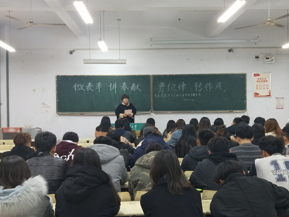 11月26日晚,艺术学院举行以“做表率 讲奉献 严纪律 转作风”为主题的学生会工作作风专题会议,学院团委书记王海燕出席,全体学生会干部参加。