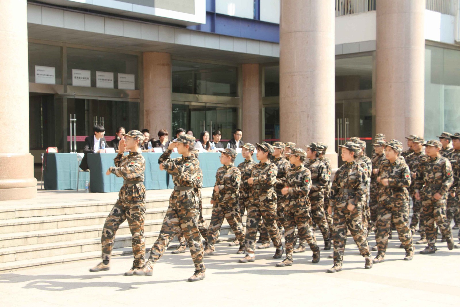 伴随着雄壮激昂的分列式进行曲,汇演开始。新生们迈着矫健的步伐,喊着振奋人心的口号通过主席台,接受领导老师的检阅。炎热的天气丝毫没有削减他们昂扬的斗志,他们步伐坚定,整齐划一,用有力的步伐踏出了完美的乐章。紧接着,他们有条不紊的完成了报数、稍息立正、跨列、蹲下起立等任务。嘹亮的口号,矫健的身影……他们精神抖擞、斗志昂扬、口号响亮、队列整齐,充分展现了艺术学子积极向上的青春风采和饱满的精神风貌。