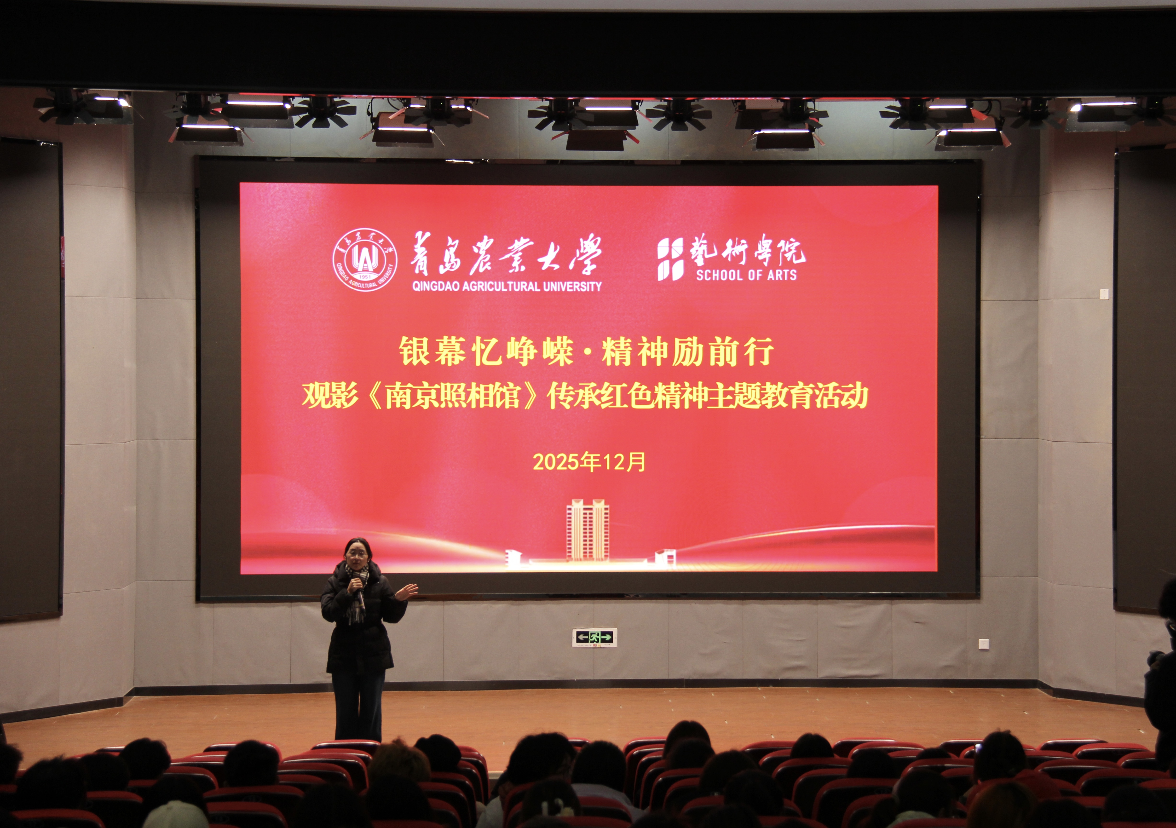 为引导广大青年赓续红色血脉、厚植爱国情怀,12月10日,艺术学院组织2025级全体同学在平度校区博学楼报告厅开展“银屏忆峥嵘·精神励前行”红色观影主题活动。活动由2025级辅导员白芳主持。