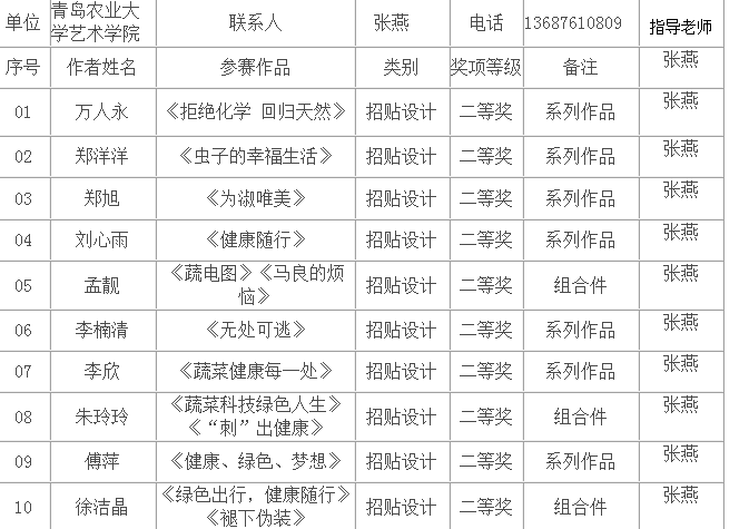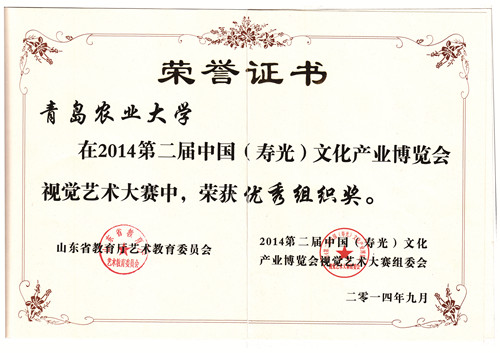 由张燕老师指导,11级视觉传达设计专业万人永、刘心雨、郑旭、郑洋洋、孟靓、李楠清等27位同学的作品获2014第二届中国(寿光)文化产业博览会视觉艺术大赛二等奖10项,三等奖奖10项,优秀奖奖7项。2014第二届中国(寿光)文化产业博览会视觉艺术大赛省级大赛,此次参赛不光检验了我院学子在设计领域理论知识学习效果和实践创造能力,同时培养了学生的创意思维,设计制作、设计实践创造能力和团队合作精神。
