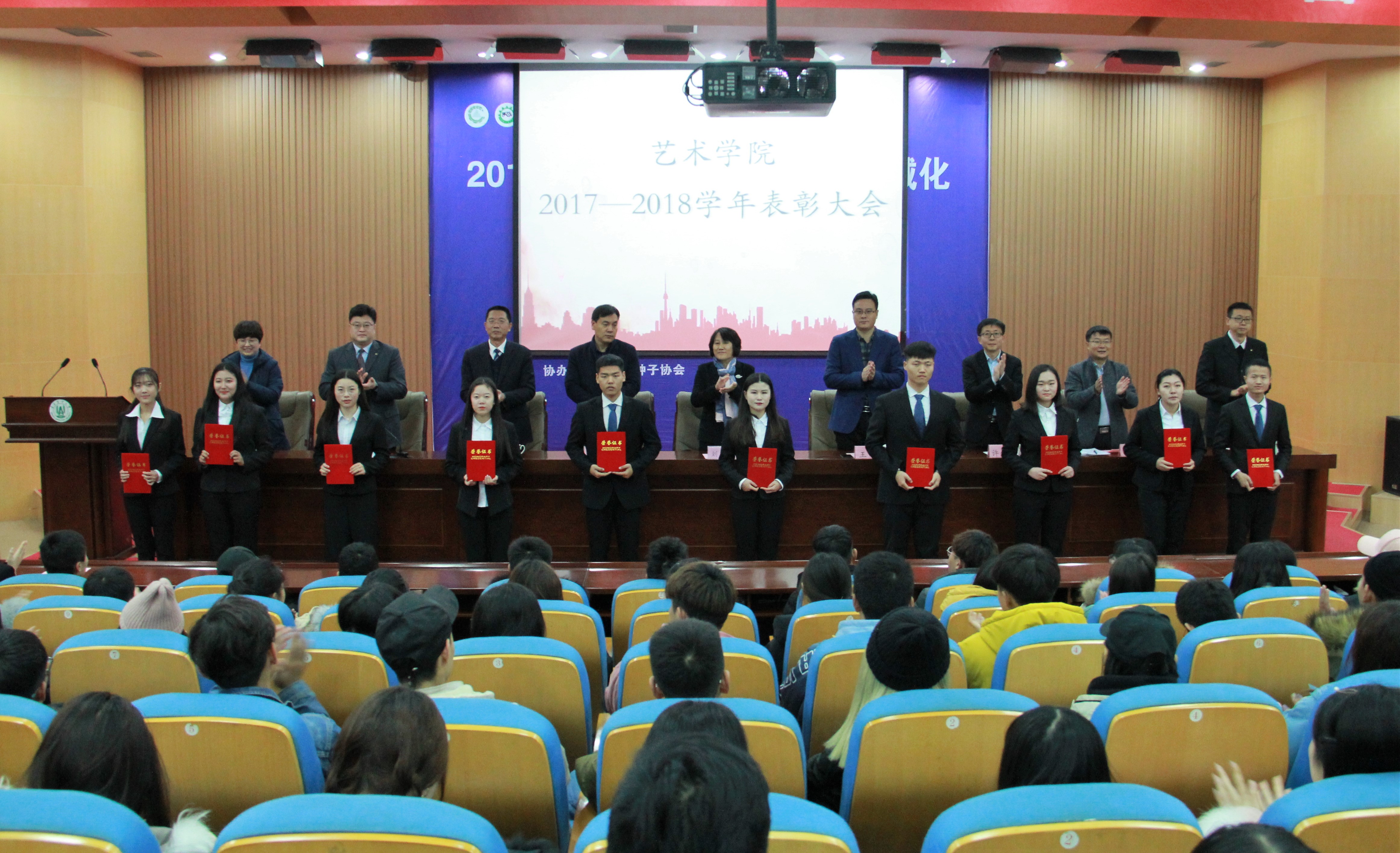 赵紫平宣读《艺术学院关于表彰2017-2018学年学生工作先进集体、先进个人的决定》,对“先进班集体”“红旗团支部”“国家奖学金”“省政府奖学金”“三好学生”“优秀学生干部”等先进集体和个人进行了表彰。与会领导为先进集体和个人代表依次颁奖。