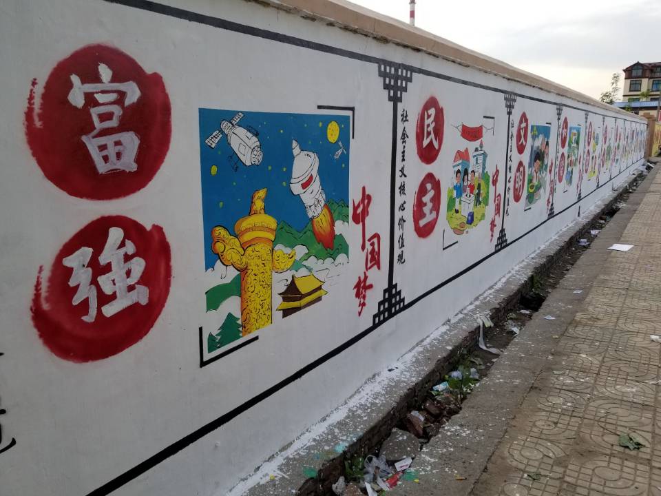 活动开展期间,同学们冒着炎炎烈日,认真细致地绘制一个个栩栩如生的墙绘人物,将“社会主义核心价值观”、“中国梦”等文明、健康、积极向上的文化气息运用墙绘的形式展现出来,将一面面旧墙壁改造成美观又会说话的文化墙,展示出新农村建设的良好风貌。