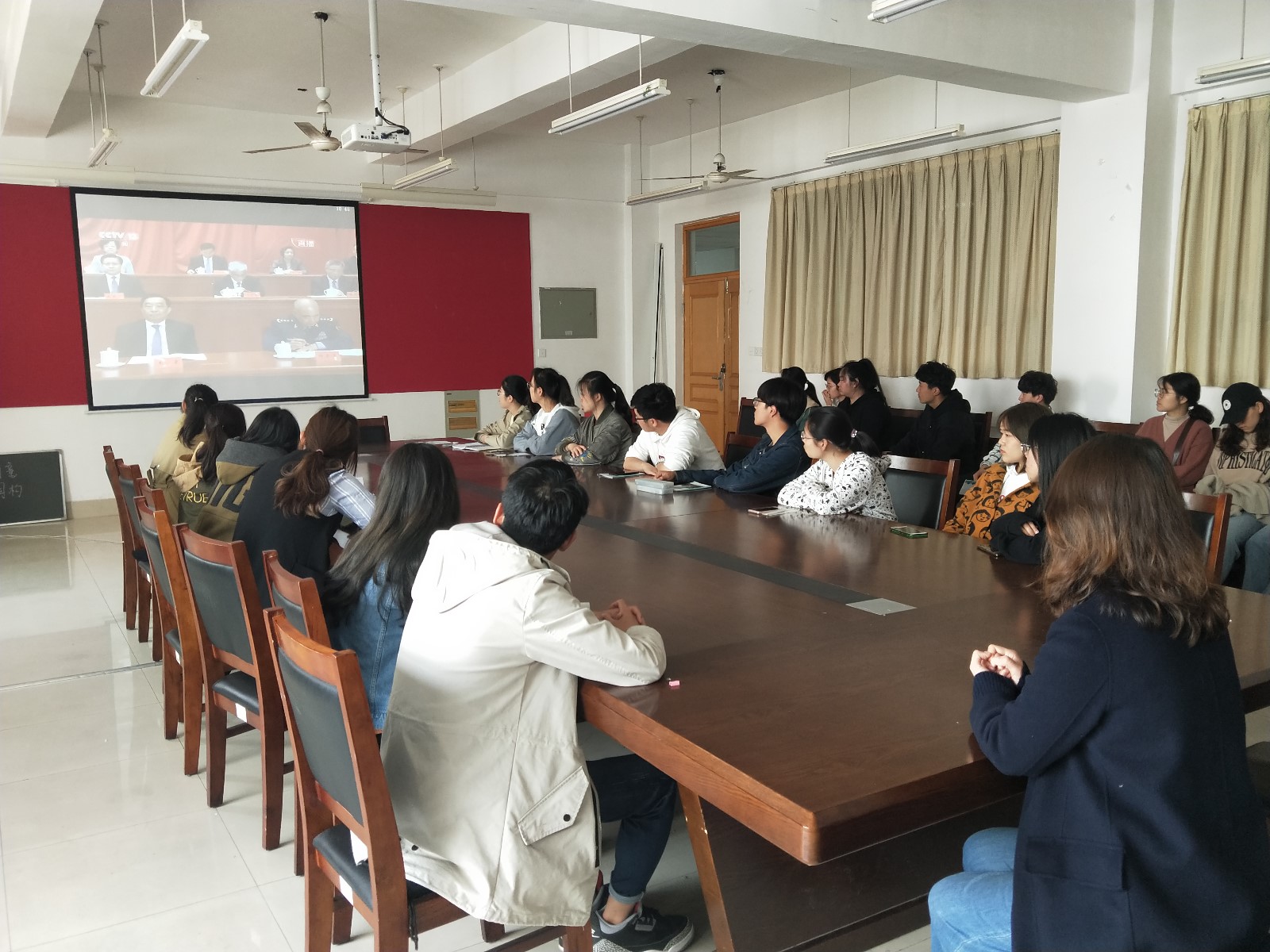 4月30日,学院组织学生干部在文经楼会议室集体观看纪念五四运动一百周年大会直播。大会中习近平总书记指出,五四运动作为一场以先进青年知识分子为先锋、广大人民群众参加的彻底的反帝反封建的伟大爱国革命运动,在近代以来的中华民族追求民族独立的历史进程中具有里程碑意义。同学们表示要铭记历史,注目今朝,珍惜先辈无畏前行带来的和平时代,以认真读书为主要方式践行五四精神,以奋斗拼搏的青春勇担新时代的重托。