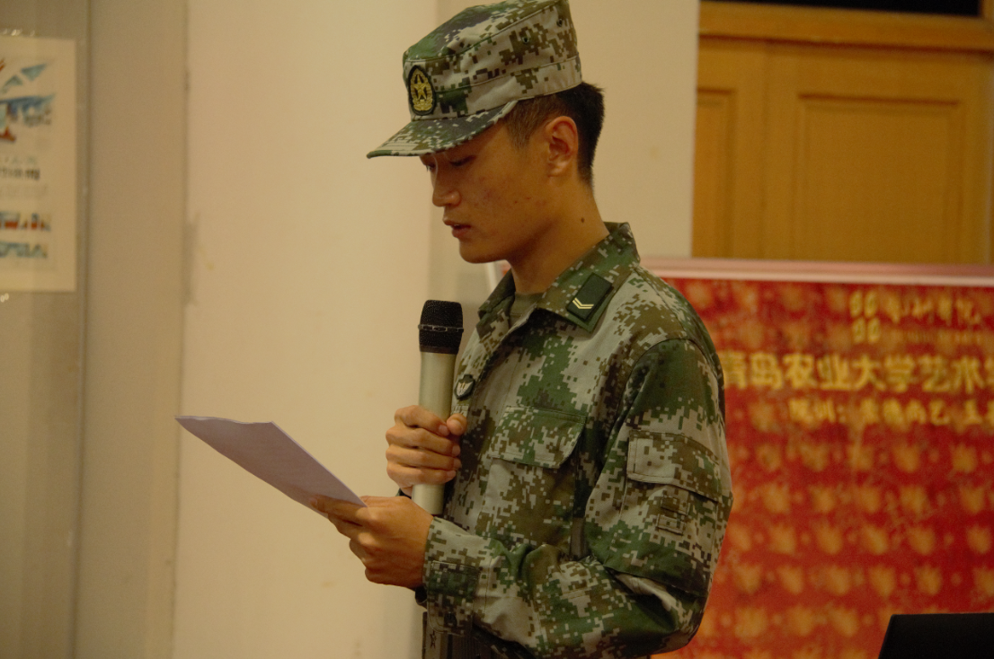 党总支副书记副院长周维维为王特、张呈平、王恩兴三名学生教官颁发了“青岛农业大学艺术学院爱国主义教育宣讲员”聘书。大学生退役士兵王特代表受聘教官发言,结合自己的服役经历,从三个方面阐述了大学生应该怎样爱国,他指出,第一要树立和培养理性爱国主义思想;第二要兼收并蓄,继承创新,以时代精神丰富爱国主义内涵;第三要将爱国热情转化为学习动力和具体行动。