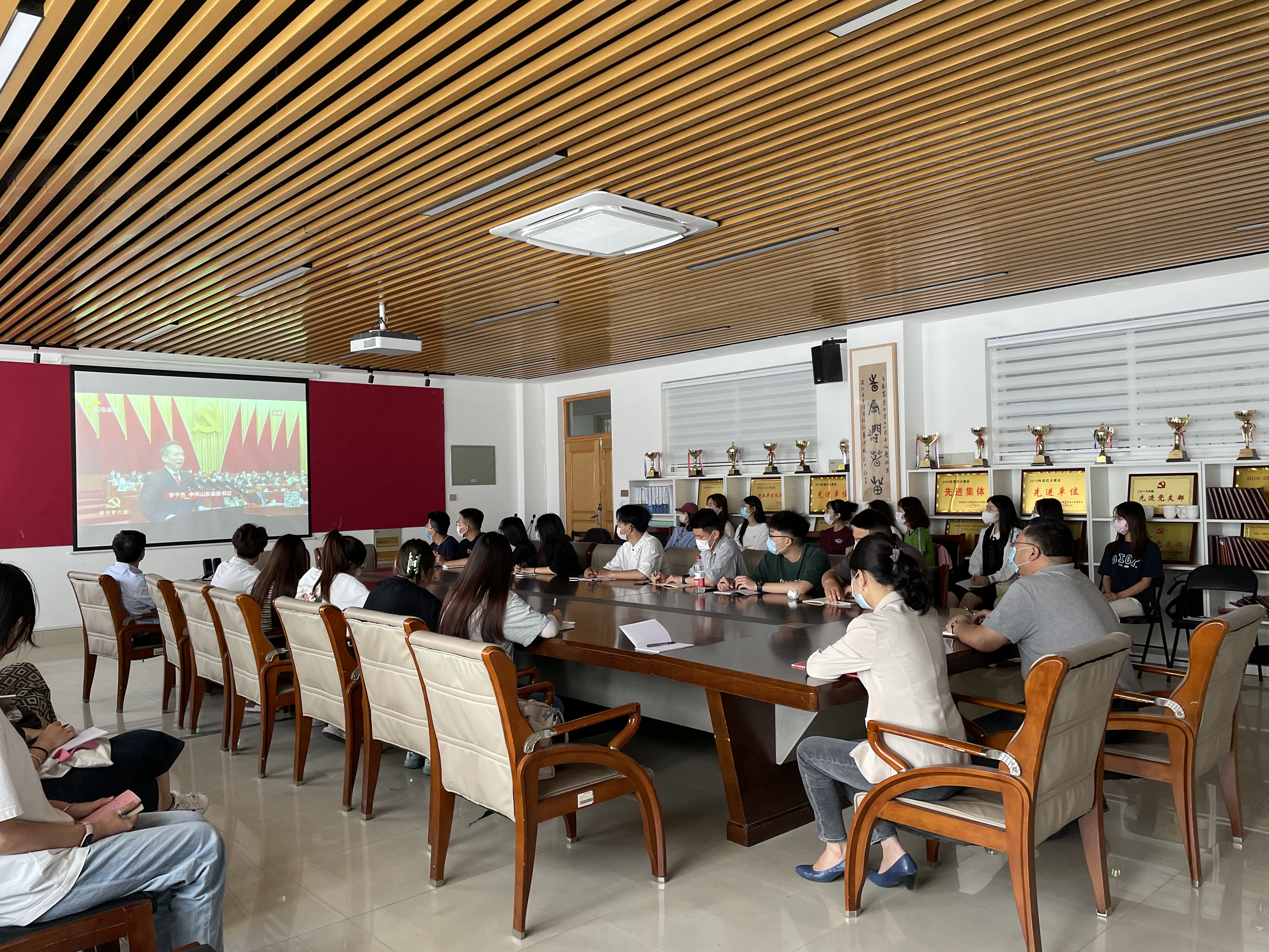 5月28日,艺术学院在学院会议室组织观看山东省第十二次党代会开幕式。党总支书记王天龙,党总支副书记、副院长周维维,团委书记李振玻和第三支部学生党员、学院入党积极分子现场集中观看,其他教工和学生居家(宿舍)观看。