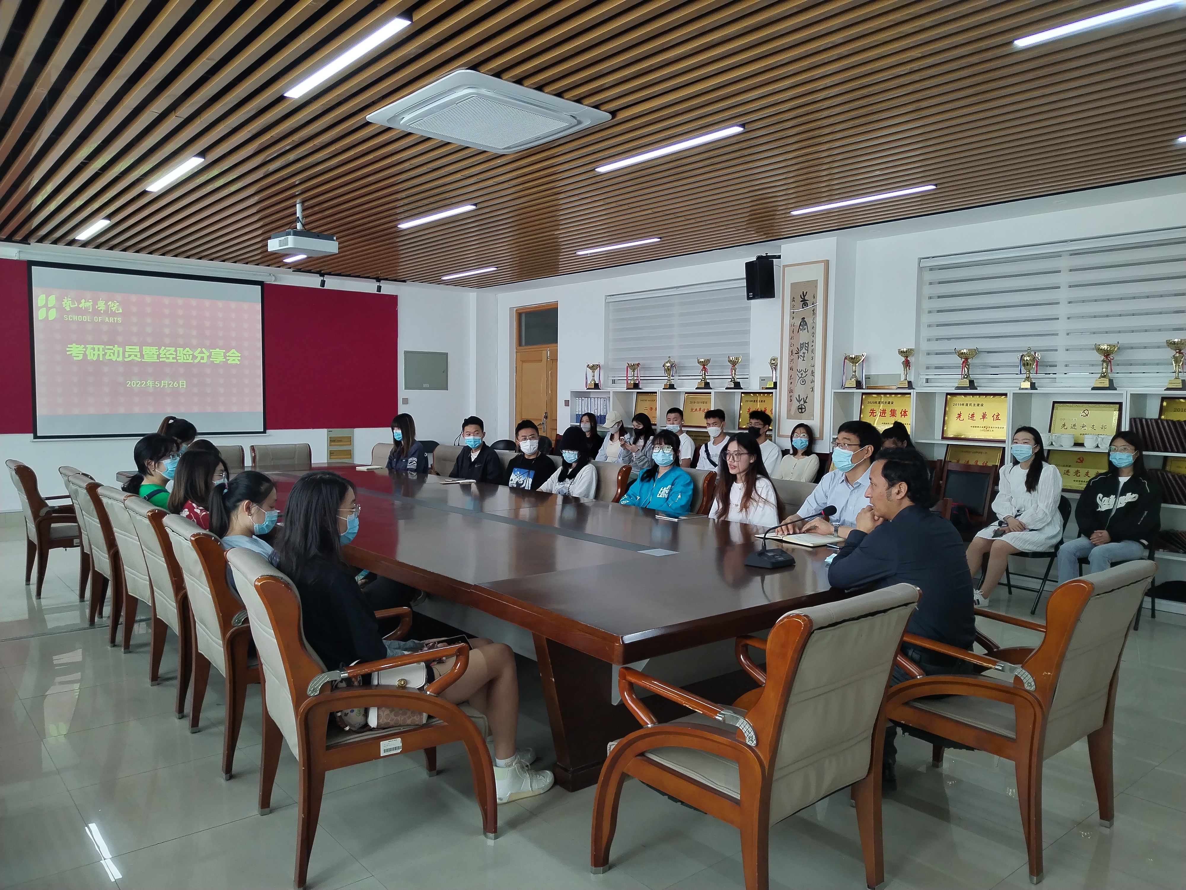 5月26日,艺术学院召开考研动员暨经验分享会,院长李慧斌,党总支副书记、副院长周维维出席会议,团委书记李振玻主持会议。会议邀请了2022届考研录取学生代表毛琳、王佳莹进行经验交流分享,2019级有志报考研究生考试的同学参加会议。