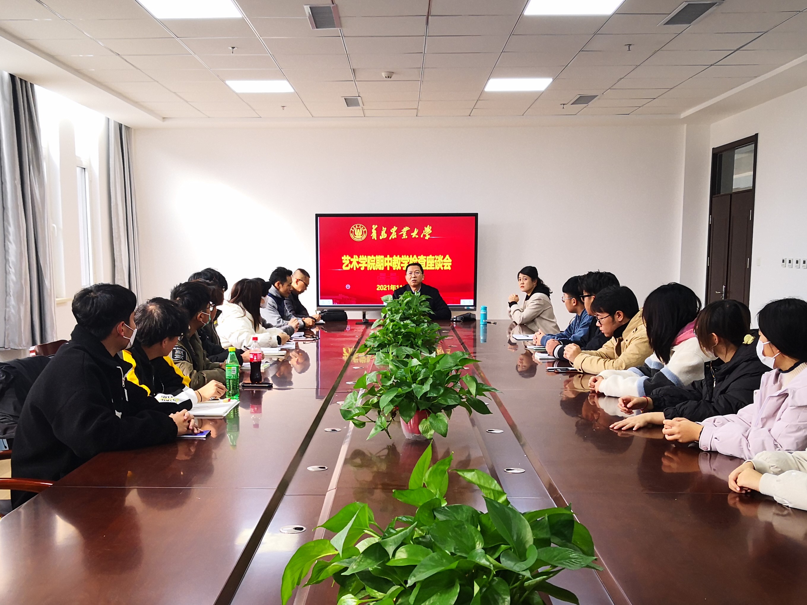 随后,学院在平度校区大学生活动中心会议室召开了期中教学检查和师生座谈会。梁永平代表学院向2021级同学介绍了开学以来学校、学院的主要工作,重点介绍了学校顺利举办庆祝建校70周年校庆活动、学院举办“耕耘·庆祝建校70周年书画展暨艺术学院教学成果展”等校友返校活动的情况。他希望同学们树立远大理想、科学规划学业、努力提高本领,度过愉快、充实的大学生活。同时认真遵守疫情防控各项要求,加强和家长的联系沟通,及时汇报自己在学校的收获体会,让家长放心,让学院放心。