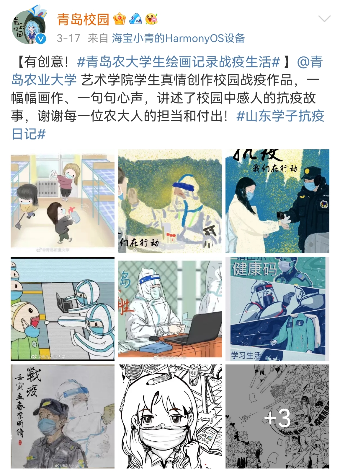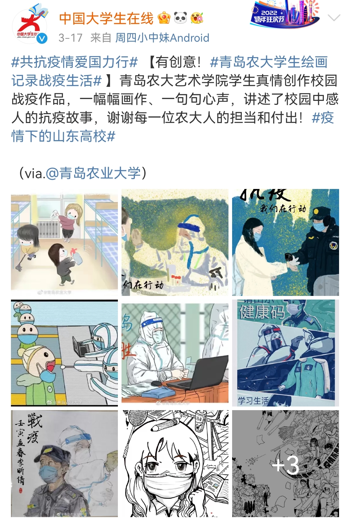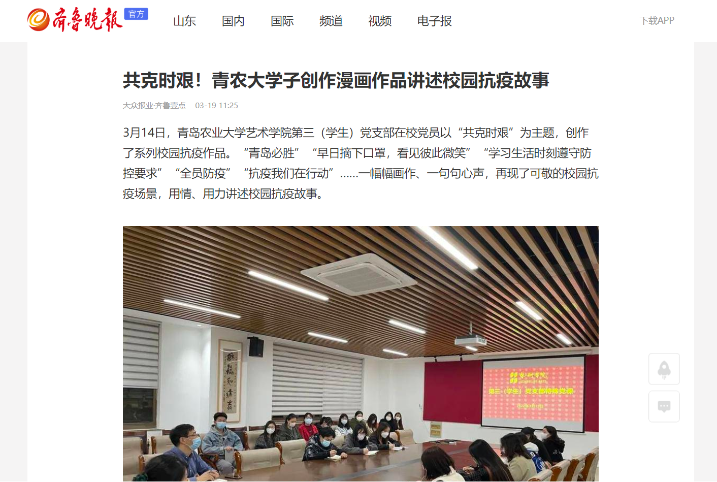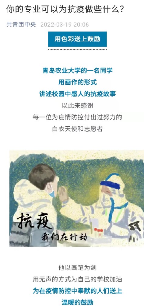 本轮疫情发生以来,青岛农业大学艺术学院第三(学生)党支部在校师生党员,第一时间成立“艺术三支部疫情防控先锋小队”,在遵守防疫要求、做好个人防护的基础上,主动承担起学院宿舍网格化管理、核酸检测组织安排和志愿服务工作,始终奋战在抗“疫”一线。支部党员发挥专业优势,以“共克时艰”为主题,创作系列作品,礼赞抗“疫”精神,凝聚抗“疫”力量。在学校有关部门大力支持和宣传下,多幅作品受到“共青团中央”微信公众号、“中国大学生在线”、“文汇教育”、“青岛校园”等媒体转发,引起广泛关注。