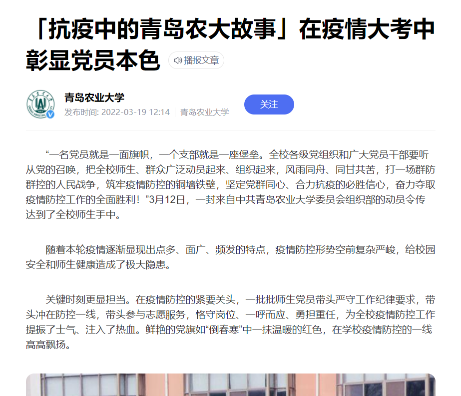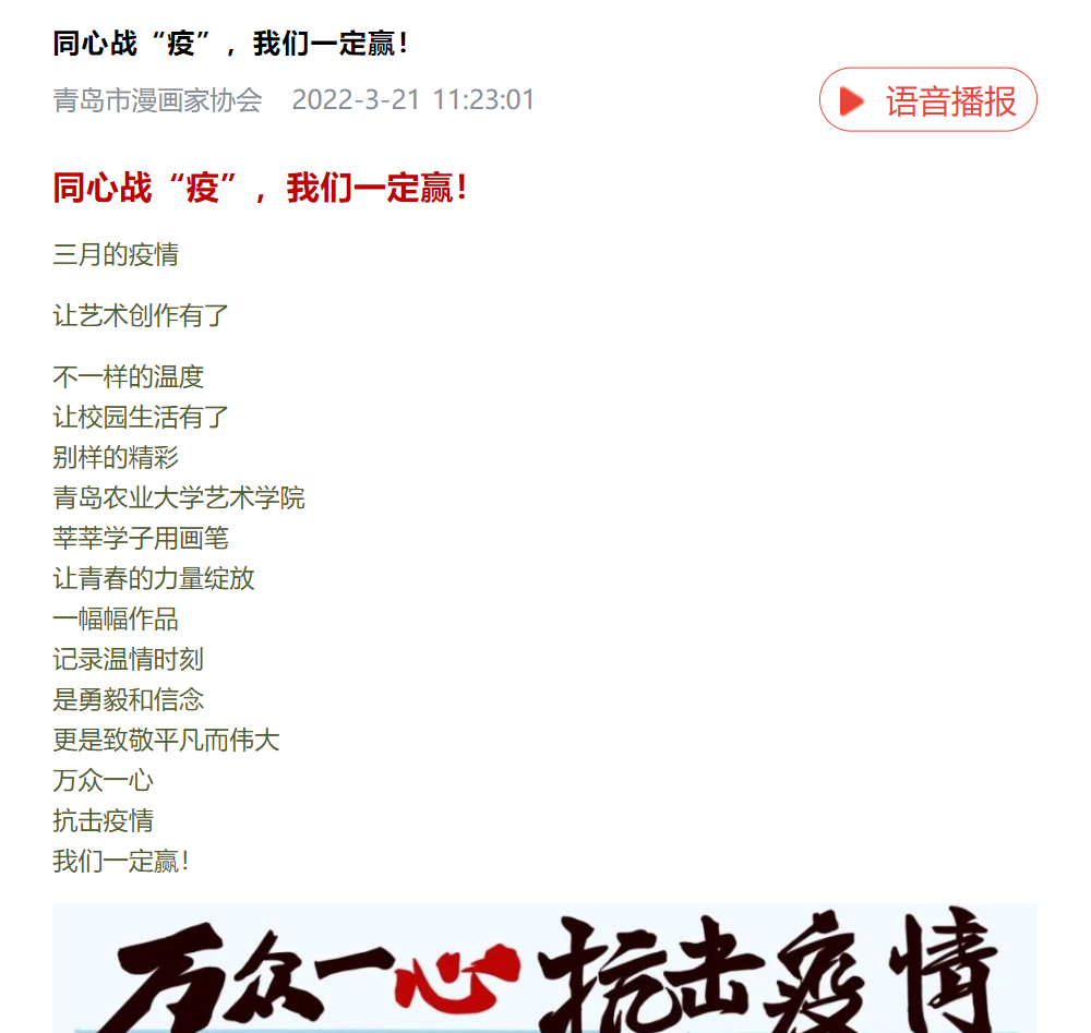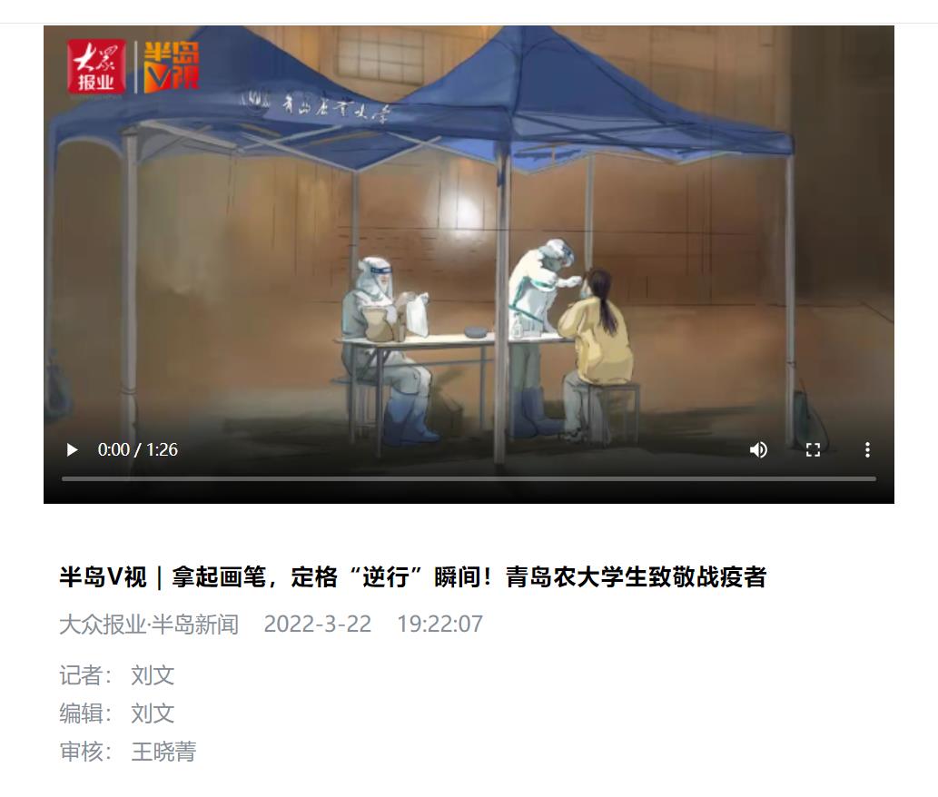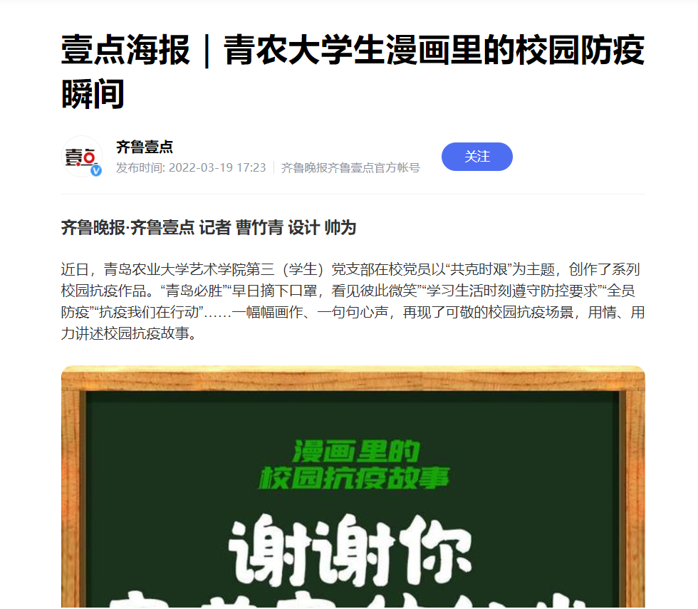 本轮疫情发生以来,青岛农业大学艺术学院第三(学生)党支部在校师生党员,第一时间成立“艺术三支部疫情防控先锋小队”,在遵守防疫要求、做好个人防护的基础上,主动承担起学院宿舍网格化管理、核酸检测组织安排和志愿服务工作,始终奋战在抗“疫”一线。支部党员发挥专业优势,以“共克时艰”为主题,创作系列作品,礼赞抗“疫”精神,凝聚抗“疫”力量。在学校有关部门大力支持和宣传下,多幅作品受到“共青团中央”微信公众号、“中国大学生在线”、“文汇教育”、“青岛校园”等媒体转发,引起广泛关注。