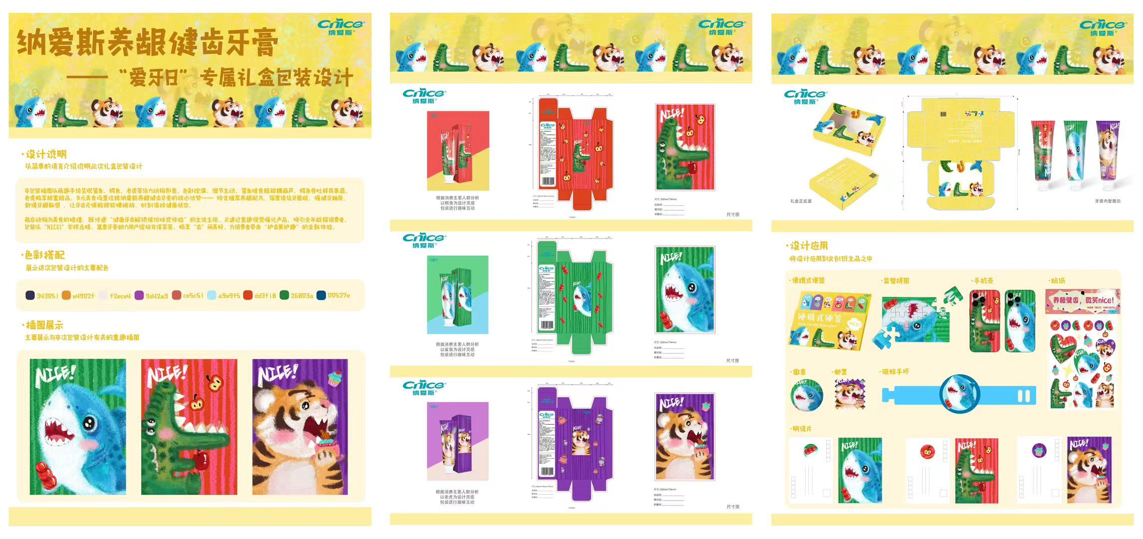 作品《纳爱斯“爱牙日”专属礼盒》深度契合纳爱斯“守护口腔健康”的品牌理念,聚焦“爱牙日”全民护齿场景,以包装为载体,巧妙融合功能表达与情感传递。设计运用萌趣动物形象,展现“畅快咀嚼、放肆享受”的生活画面,动物健硕的牙齿呼应牙膏健齿功效,甜趣食物符号则传递清洁护齿后的愉悦体验。整体设计鲜活生动,兼具年轻审美与产品价值传达,以节日礼盒形式传递品牌温度,凭借清晰的品牌逻辑与独特的设计语言赢得评委一致认可。