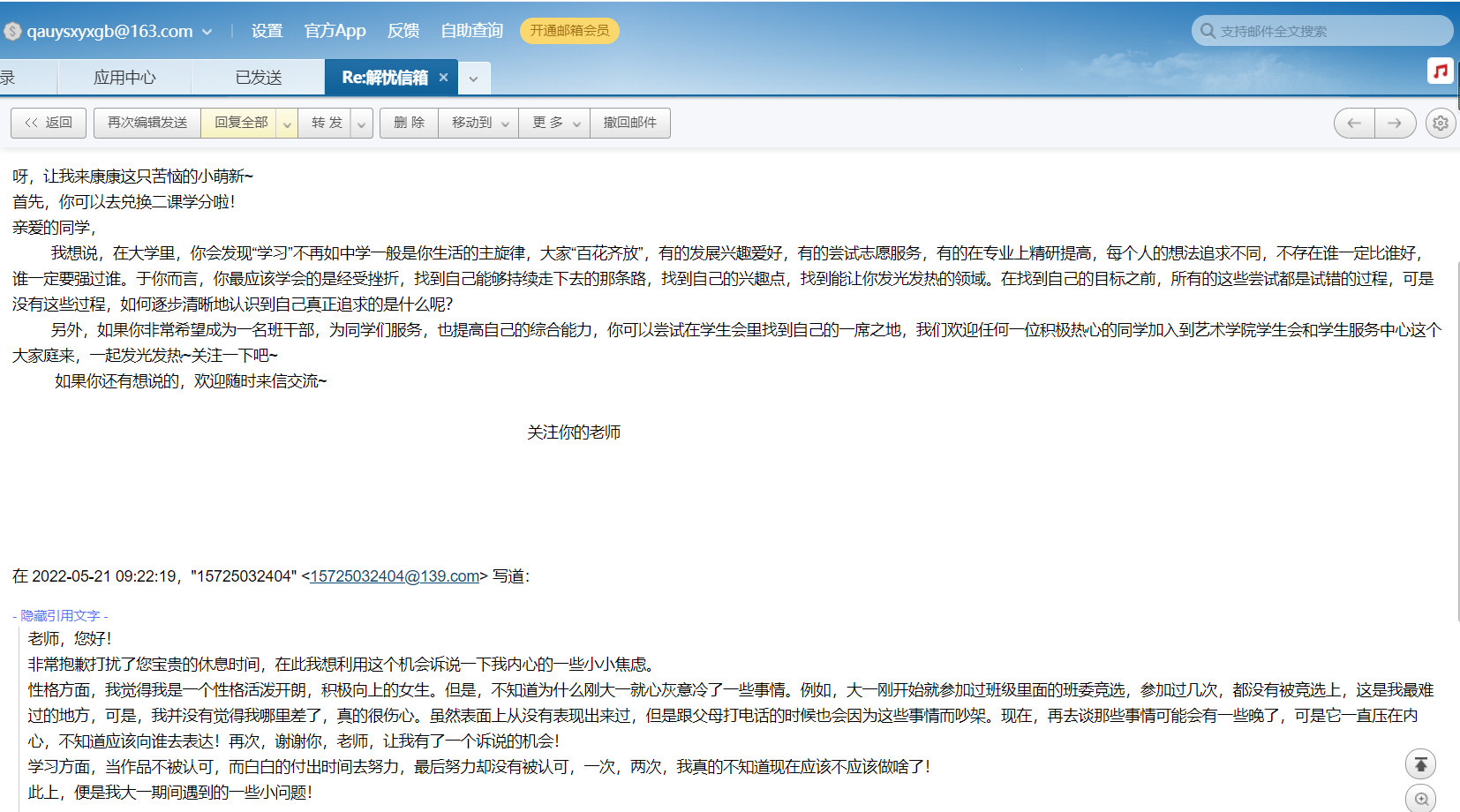 辅导员在“解忧信箱”给同学们回信↑↑↑