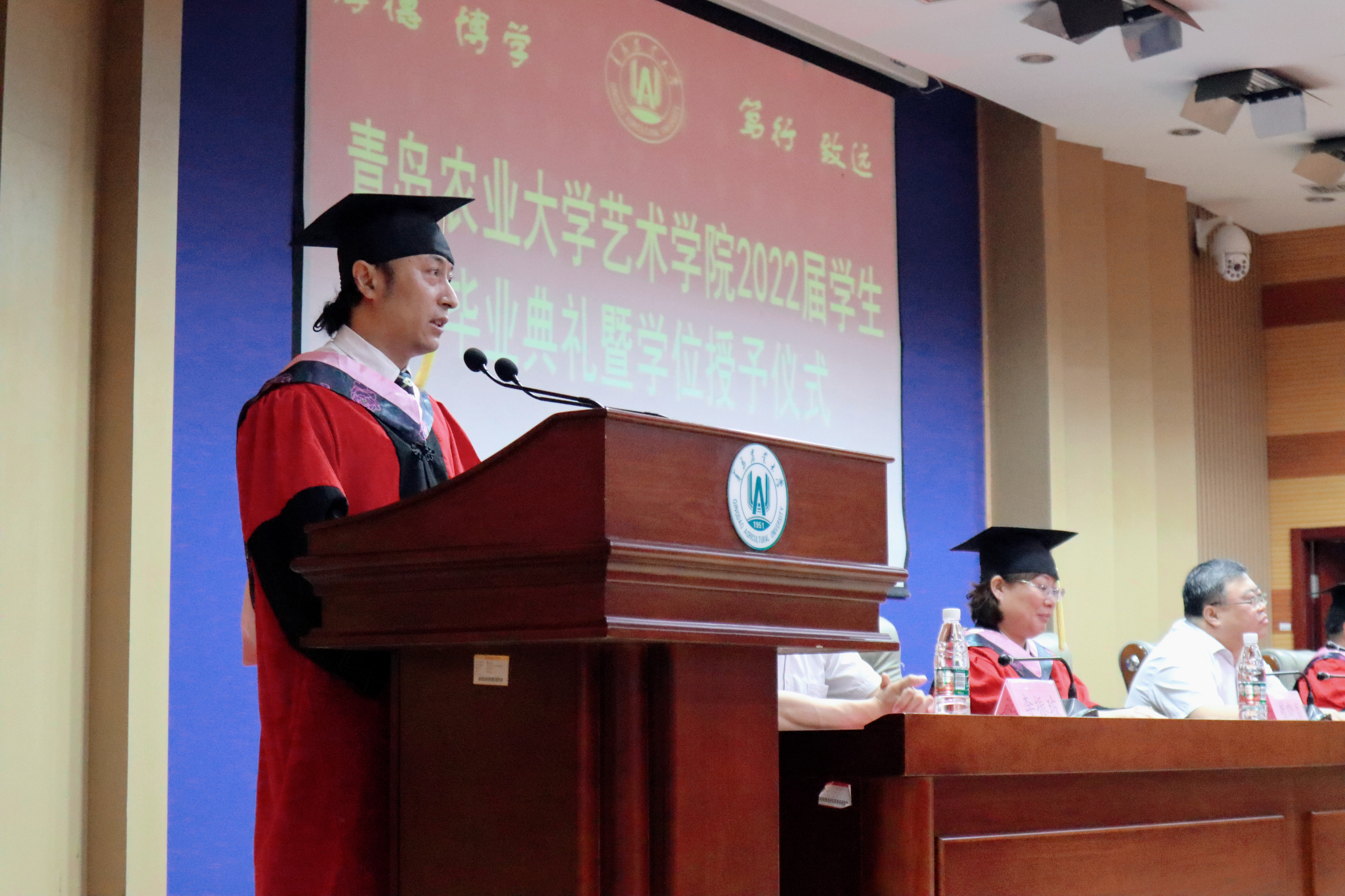 院长李慧斌致辞,向圆满完成大学学业、即将顺利开启新征程的2022届毕业生表示热烈祝贺,与毕业生共同回顾了大学四年的美好生活。李慧斌希望同学们牢记总书记嘱托,传承“厚德博学、笃行致远”校训和青农精神,秉承“崇德尚艺、至善尽美”院训和艺术理想,努力成长为有理想、敢担当、能吃苦、肯奋斗的新时代好青年;发挥专业优势,把更多美术元素、艺术元素应用到城乡规划建设中,增强城乡审美韵味、文化品位;弘扬中华美育精神,做一名追求德艺双馨的文艺工作者,以优异成绩回报母校、学院的精心培养。