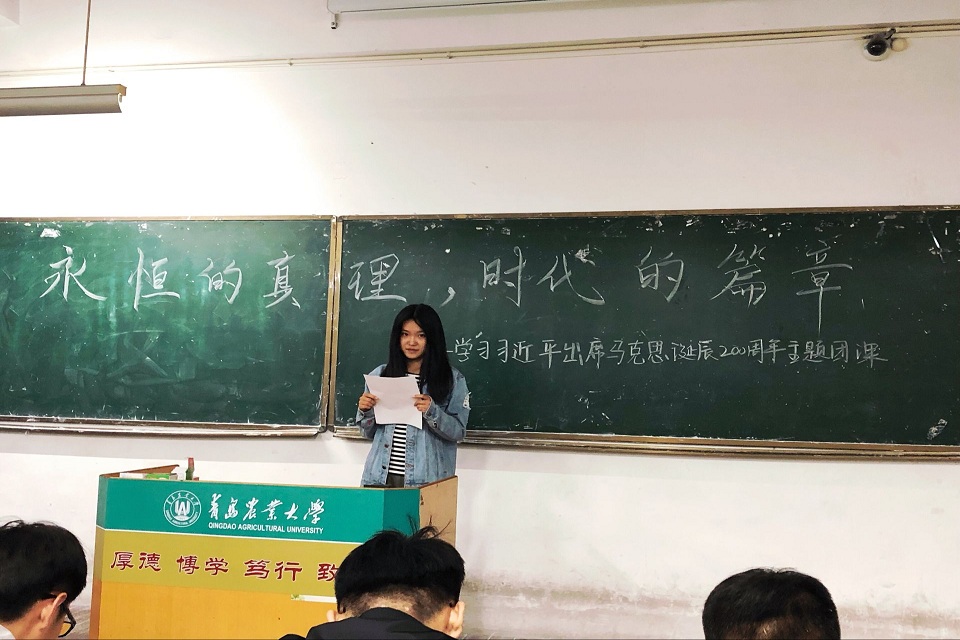 5月6日,艺术学院在教学区开展主题团课,学习习近平总书记在纪念马克思诞辰200周年大会上发表的重要讲话精神,16、17级全体学生参加。