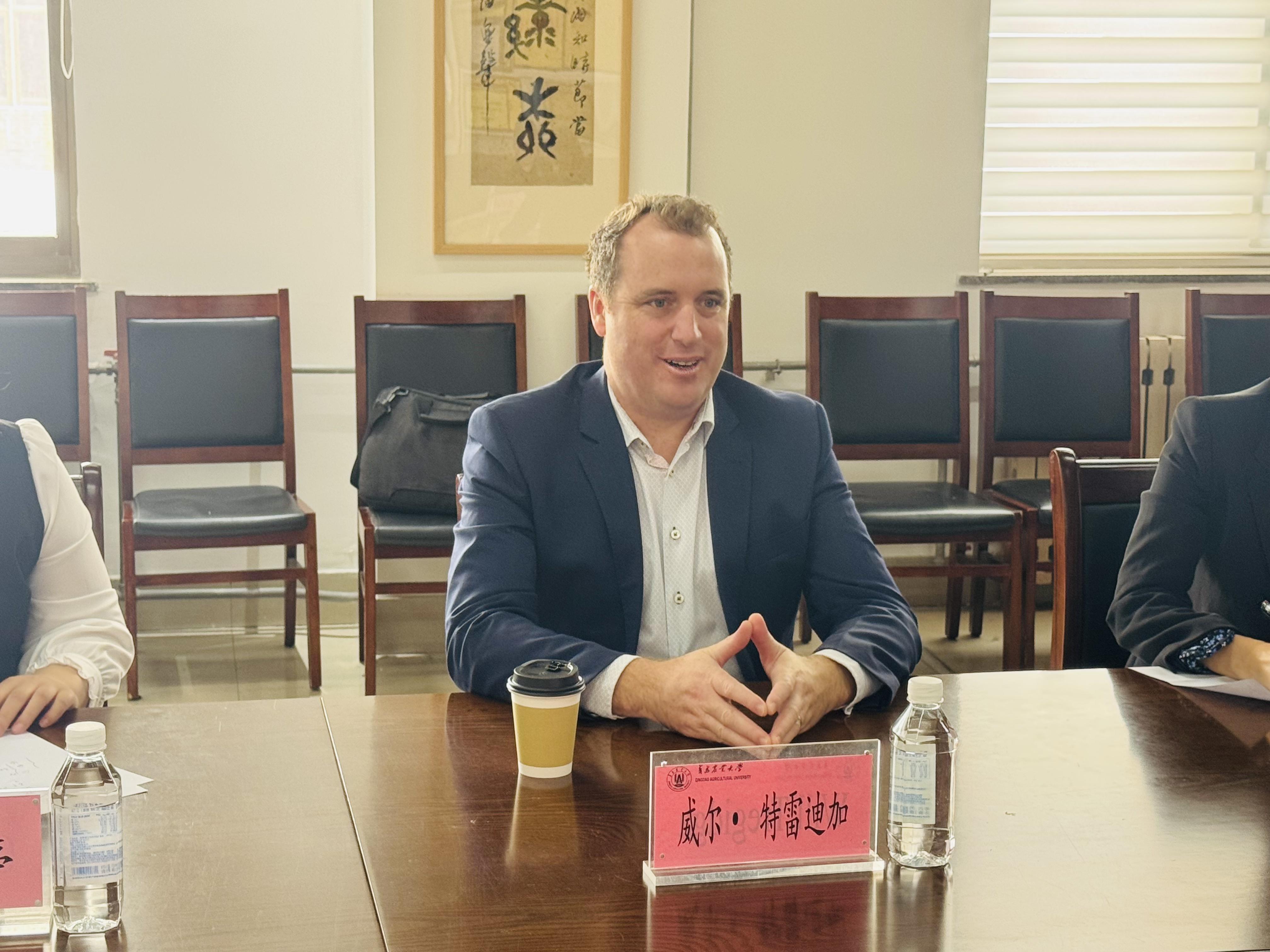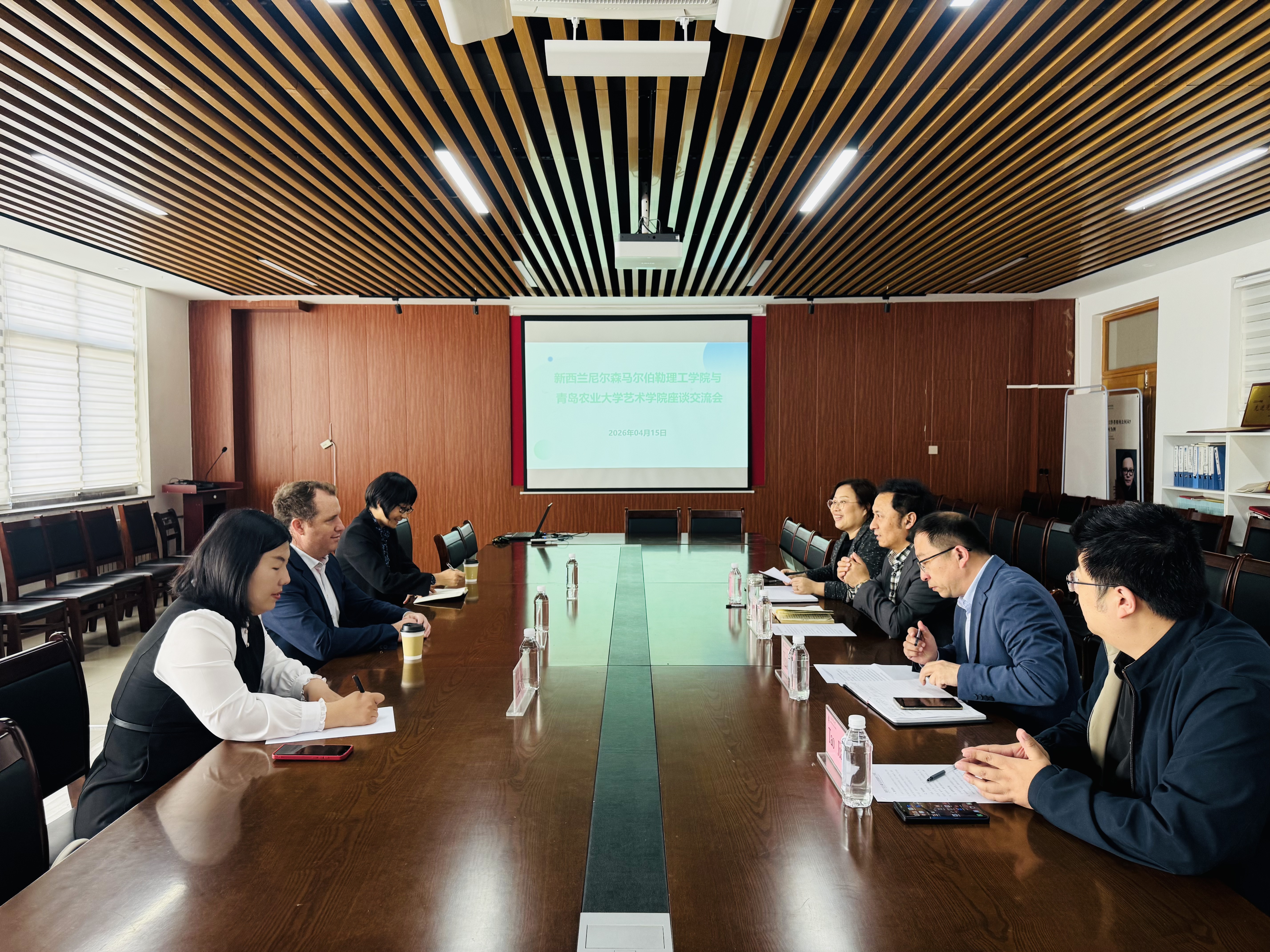 4月15日,新西兰尼尔森马尔伯勒理工学院代表团一行来访青岛农业大学艺术学院,双方在学院会议室举行合作座谈交流会。新西兰尼尔森马尔伯勒理工学院国际部主任威尔·特雷迪加(Will Tregidga)、中国项目主管杨乃琦(Naiqi Yang)出席会议;青岛农业大学国际合作交流处王朝婷老师,艺术学院党委书记刘晓华、院长李慧斌、党委副书记、副院长姜涛会见来访客人,副院长崔晓磊主持会议。