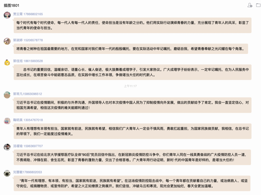 插图1801班团支部认真学习了习近平总书记给北京大学援鄂医疗队全体“90后”党员的回信。他们表示将谨记总书记的谆谆教导,在实践中增长本领,不惧风雨、勇挑重担,让青春在党和人民最需要的地方绽放绚丽之花。
