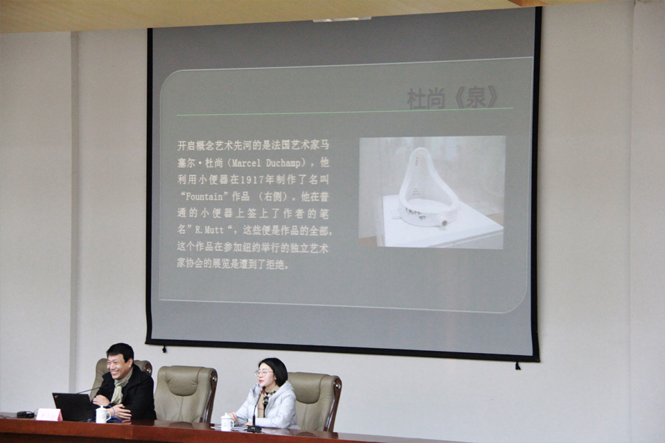 他讲述了杜尚与吴冠中等名家的创作故事,指出同学们不应把目光局限于学习名家,一味的模仿不可取。艺术是作为概念而存在的,因为艺术概念的存在,艺术作品被赋予了意义。这番精彩的演讲,赢得了同学们的热烈掌声。