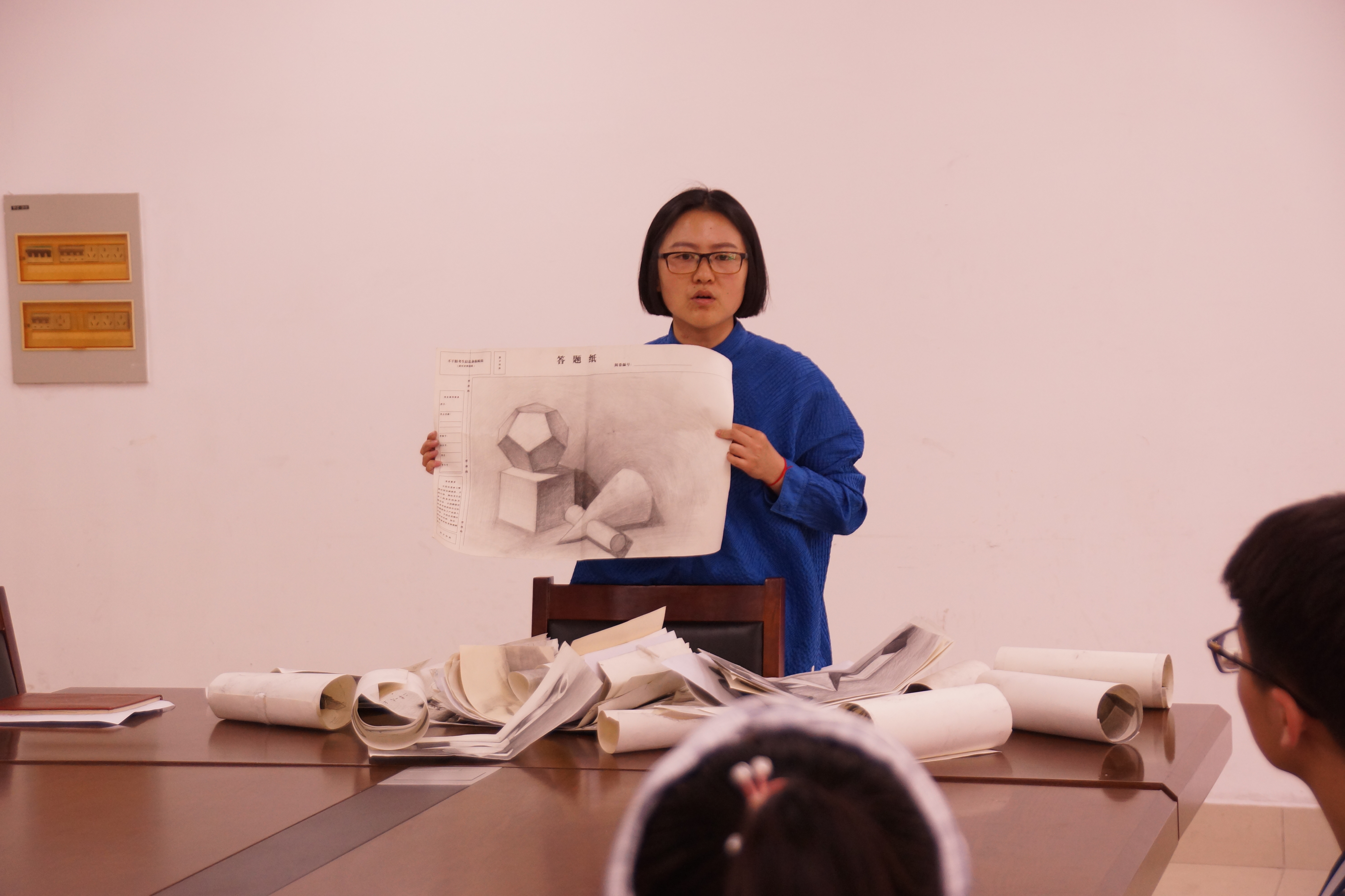 艺术学院实验中心主任孙少楠对学生绘画作业的点评。孙少楠老师针对学生的绘画作品,尤其是素描作品进行了集中和分别点评,表扬优点的同时,反反复复提到并勉励同学们:一定要对比例、透视、结构、穿插这些概念好好理解和把握,多去观察比较,多练习。