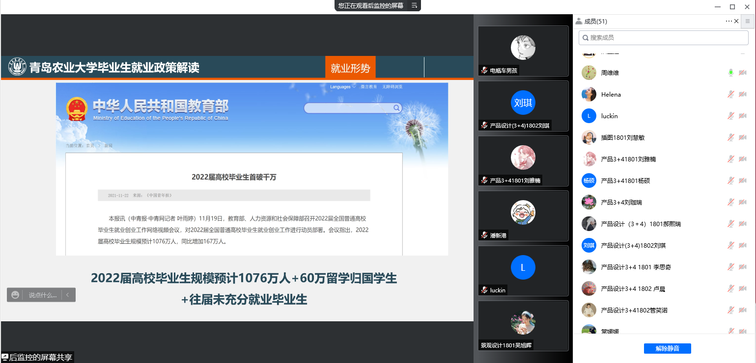 讲座分为就业政策解读、疫情形势下就业对策建议、多种类型就业方式分析、疑难问题解答等四个方面,向毕业生进行了国家、省市有关就业政策的解读,分析了当前疫情和经济下行压力加大形势下求职就业面临的现实困难,并提供了解决途径和意见建议。讲座运用大量颇具教育意义的真实案例,引导同学们科学认清就业形势,积极主动了解就业信息,切实提高就业成功率。“先解决现实问题、再考虑事业发展”、“抓紧校园招聘‘金三银四’黄金时间,不要把自己由“校招”拖为“社招”等切实管用的建议,为毕业生求职就业提供了及时有效的帮助。