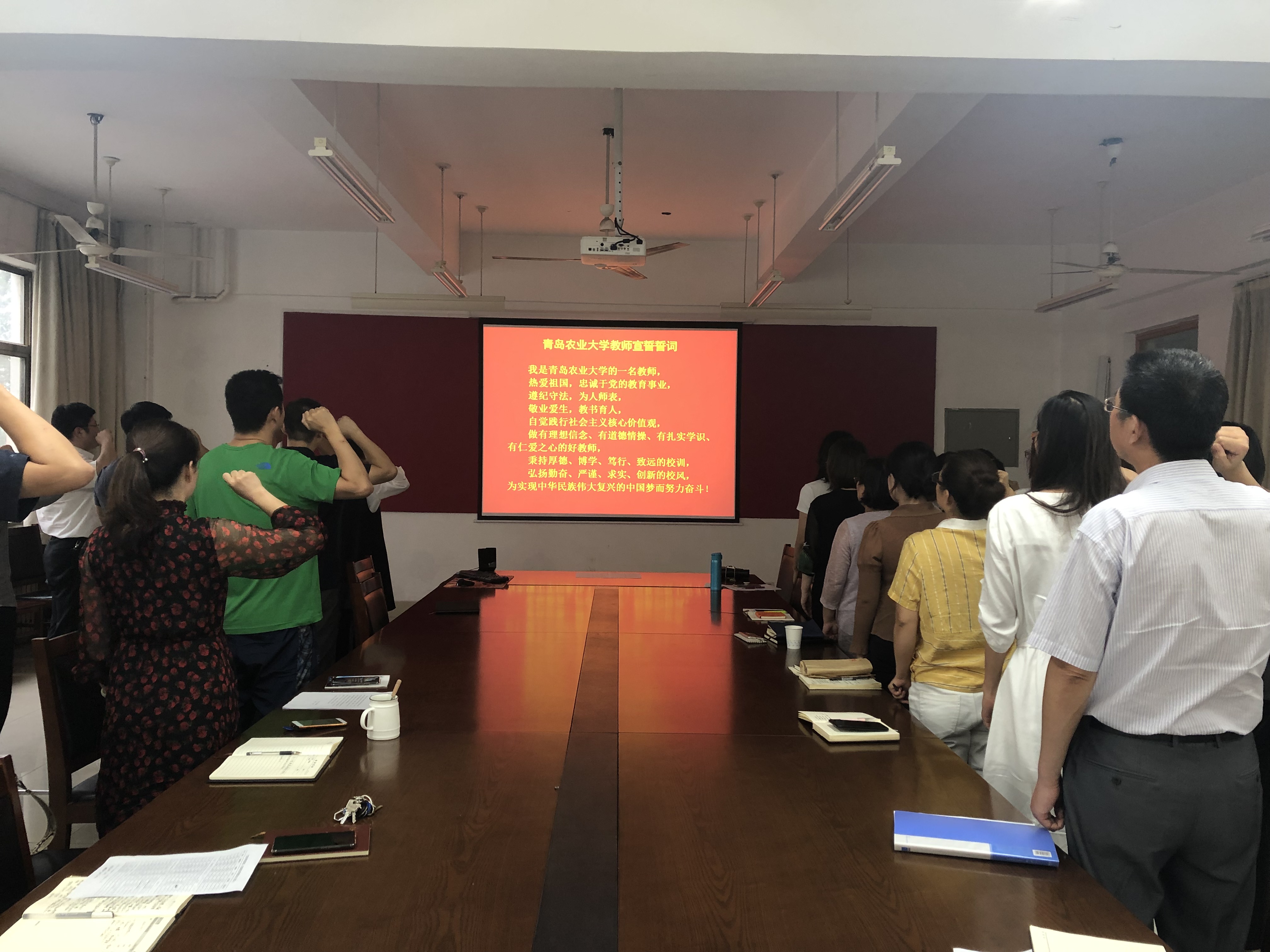 学院辅导员白芳老师带领全体教师高举右手,庄严宣誓:“我是青岛农业大学的一名教师,热爱祖国,忠诚于党的教育事业,遵纪守法,为人师表,敬业爱生,教书育人……为实现中华民族伟大复兴的中国梦而努力奋斗!”