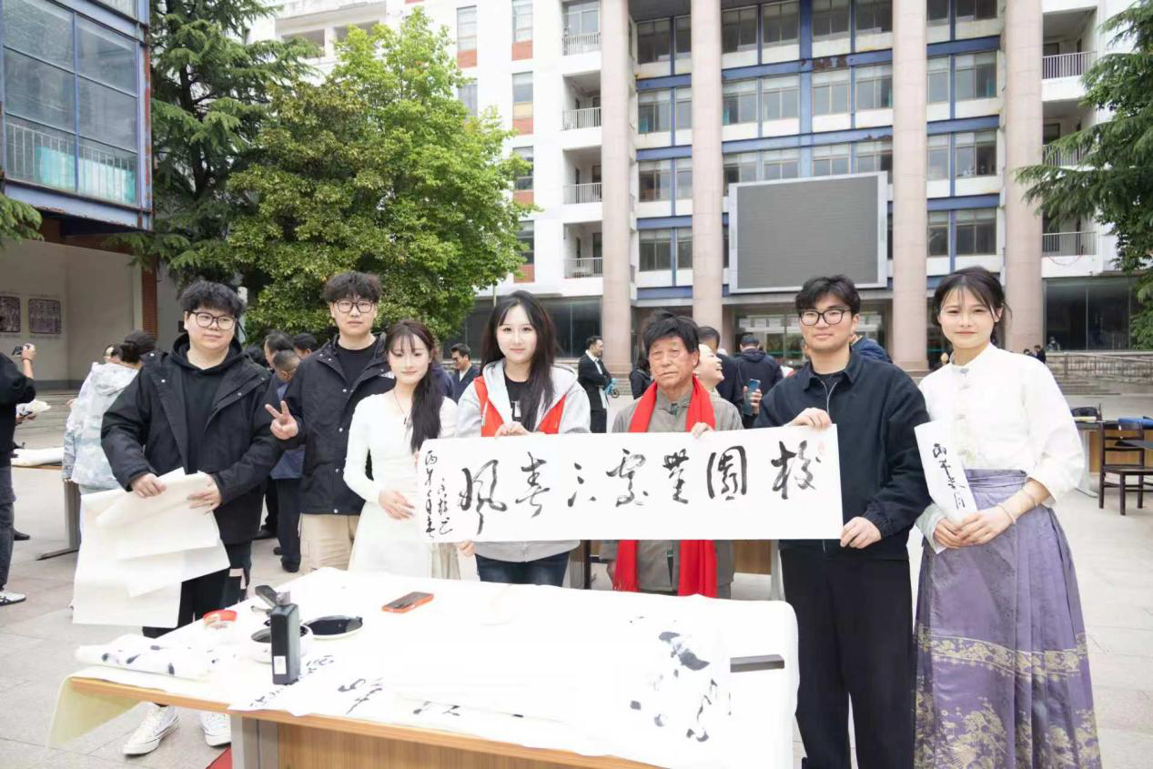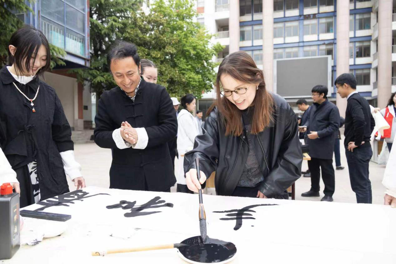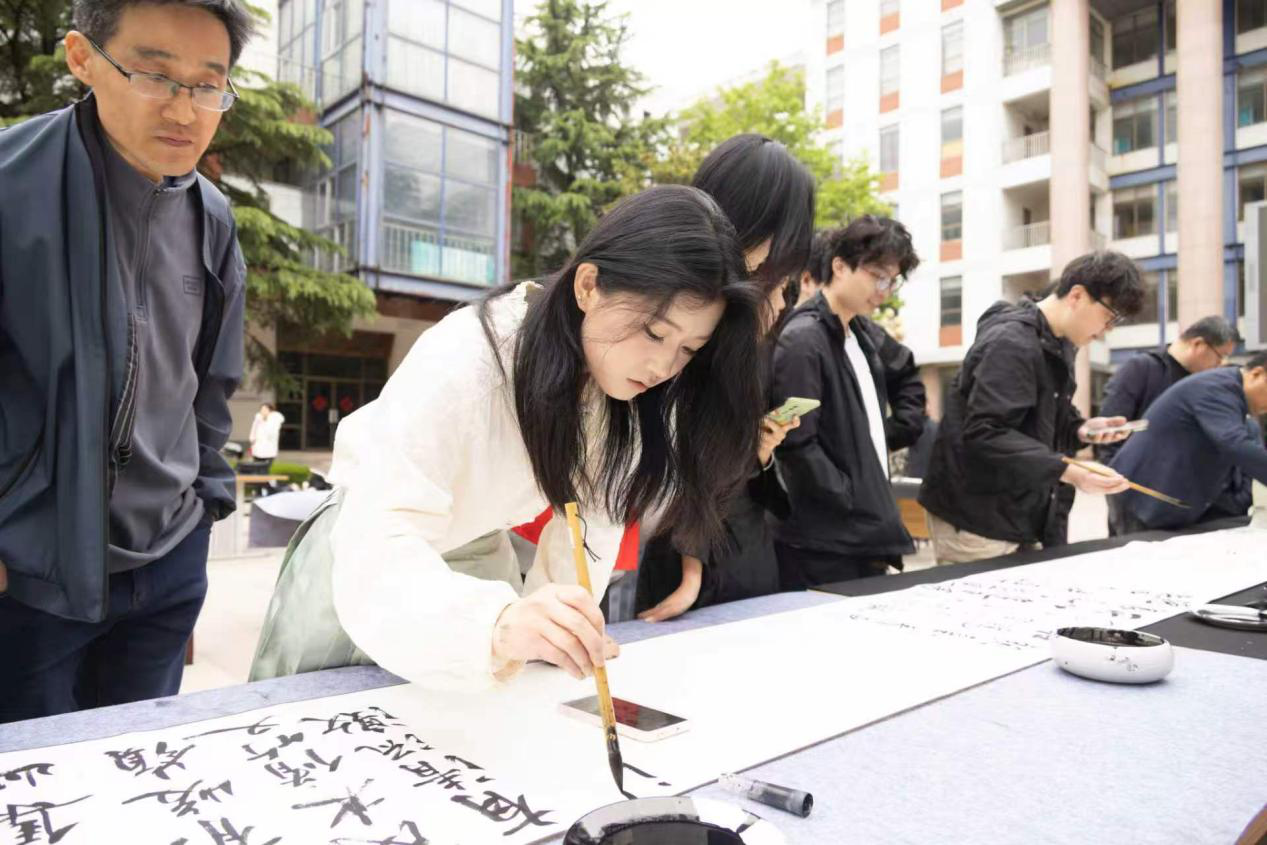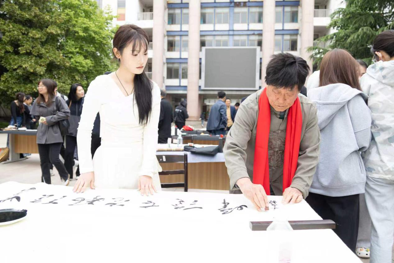 活动现场,书法家、离退休书法爱好者、艺术学院书法专业师生即兴创作,篆隶楷行草各展风姿。国际教育学院留学生们也在书法家们的指导下,亲身体验中国书法艺术,在浓淡墨香与横竖撇捺之间,感受中国书法的艺术魅力,触摸中华优秀传统文化的深厚底蕴。