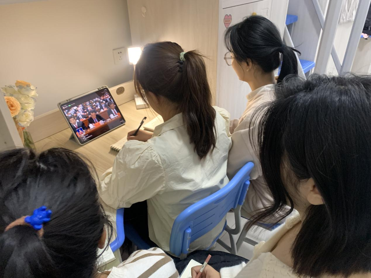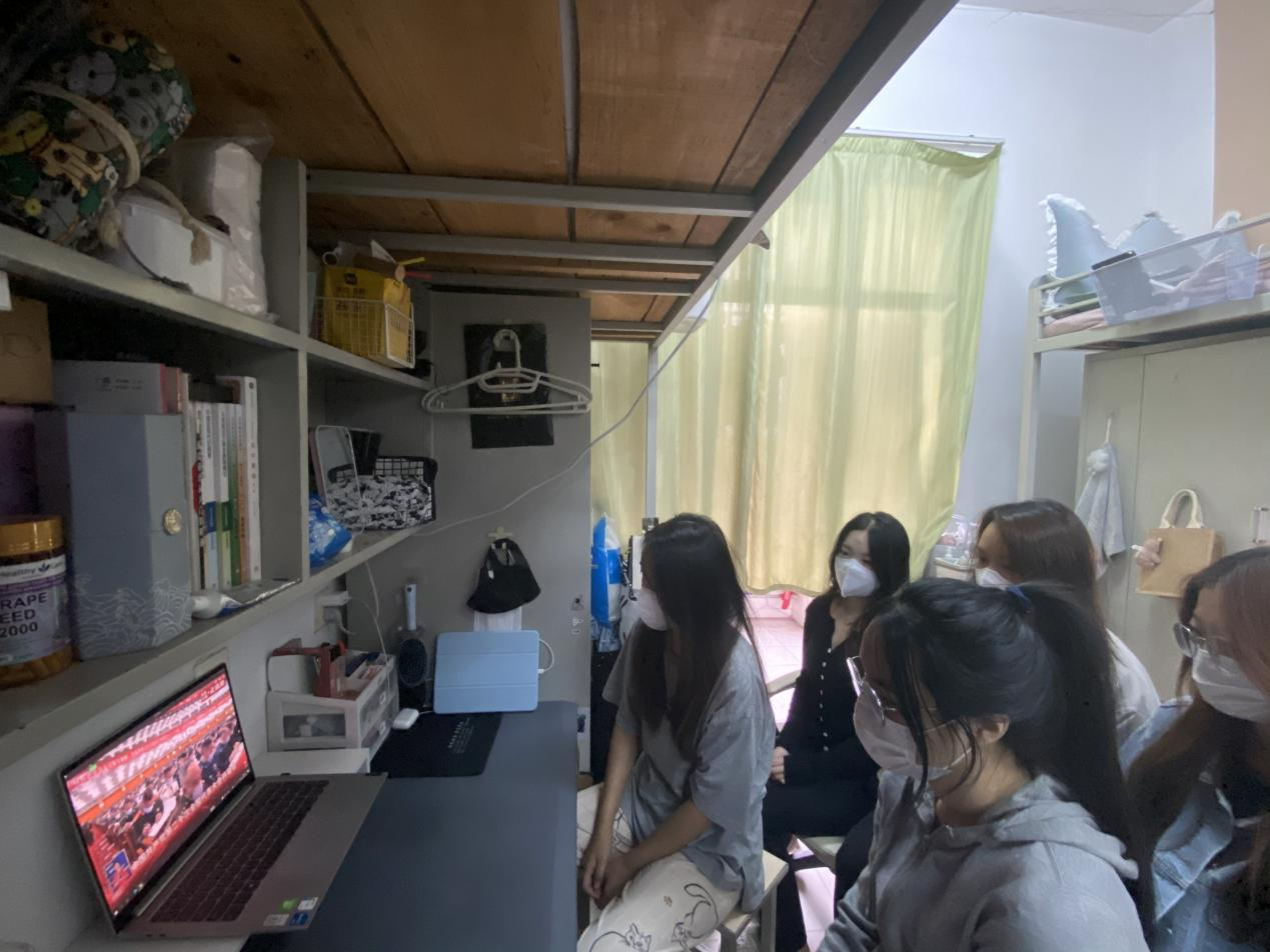 (学生以宿舍为单位集体收看大会实况)