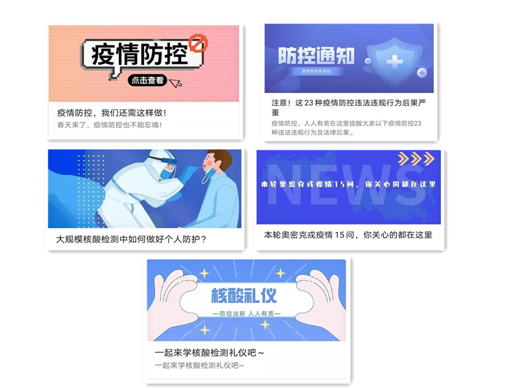学院微信公众号连续发布了多篇疫情防控主题文章,《疫情防控我们还需这样做》《注意!这23种疫情防控违法违规行为后果严重》《大规模核酸检测中如何做好个人防护》《本轮奥密克戎疫情15问,你关心的都在这里》《一起来学核酸检测礼仪吧》等内容,不断加强宣传教育引导。