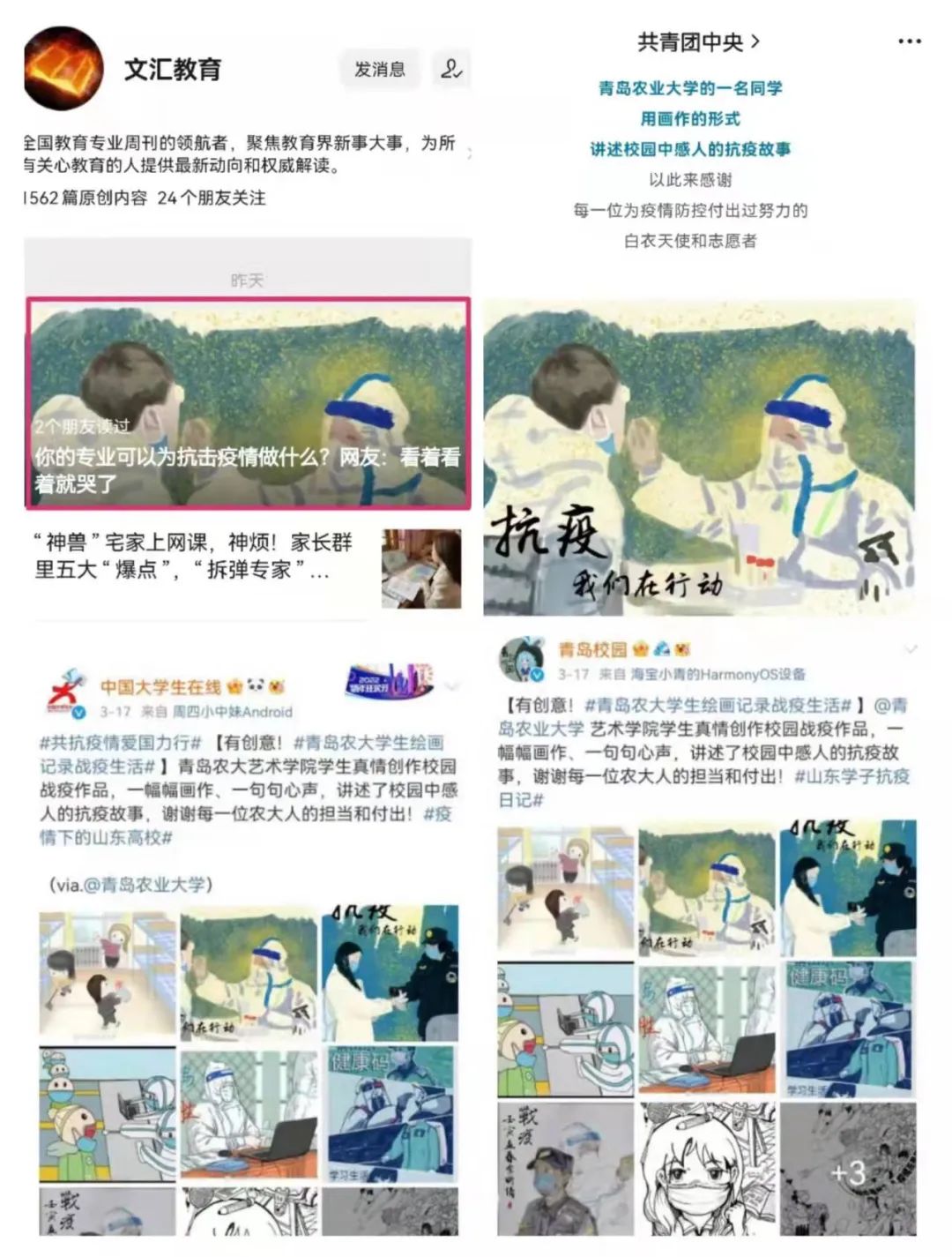 在支部带动下,全院学生深受鼓舞,紧跟步伐,提笔创作。学院面向全体学生举办“共克时艰 抗疫有我”作品征集大赛,“齐鲁壹点”以《青岛农大艺术学院又一大波校园抗疫作品,来了》为题进行宣传报道,山东教育电视台“山东教育新闻”微博也进行了转发。老师们将疫情“危机”转化为课程思政“契机”,指导学生创作了抗疫主题的壁纸、插画、徽章等。3月26日,学校微信公众号对部分作品进行了刊发。
