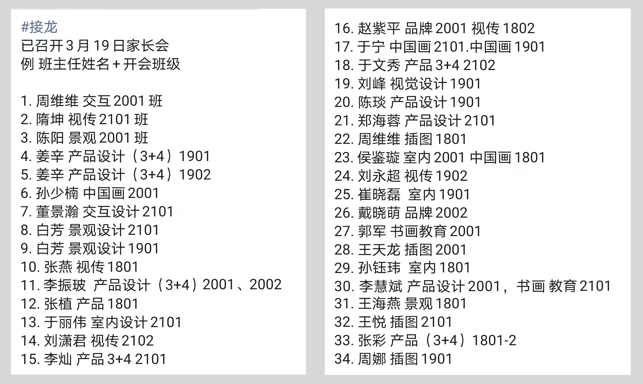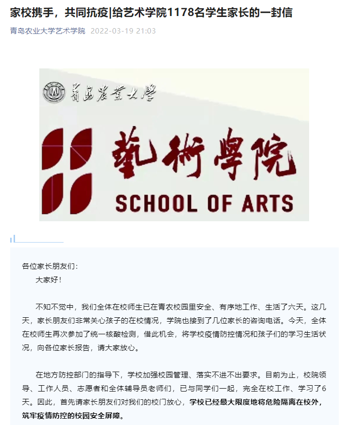 疫情牵动着家长的心。为切实做好家校沟通交流工作,最大限度争取家长对学校疫情防控工作的理解和支持,3月19日,全院班主任老师分别召开线上家长会,向家长通报学校疫情防控情况和学生学习生活状况,请家长放心、安心。同时请家长和老师一起,及时向学生讲解当前国内多点散发的疫情防控形势,共同携手维护学生身心安全。当天,学院微信公众号发布《家校携手,共同抗疫|给艺术学院1178名学生家长的一封信》,公布学工办电话,进一步加强家校沟通联系。项项举措得到广大家长的支持和认可,不少家长在家长群留言,感谢学校学院为学生所做的工作,并表示继续支持学校疫情防控措施要求,一起做好防疫宣传教育工作。